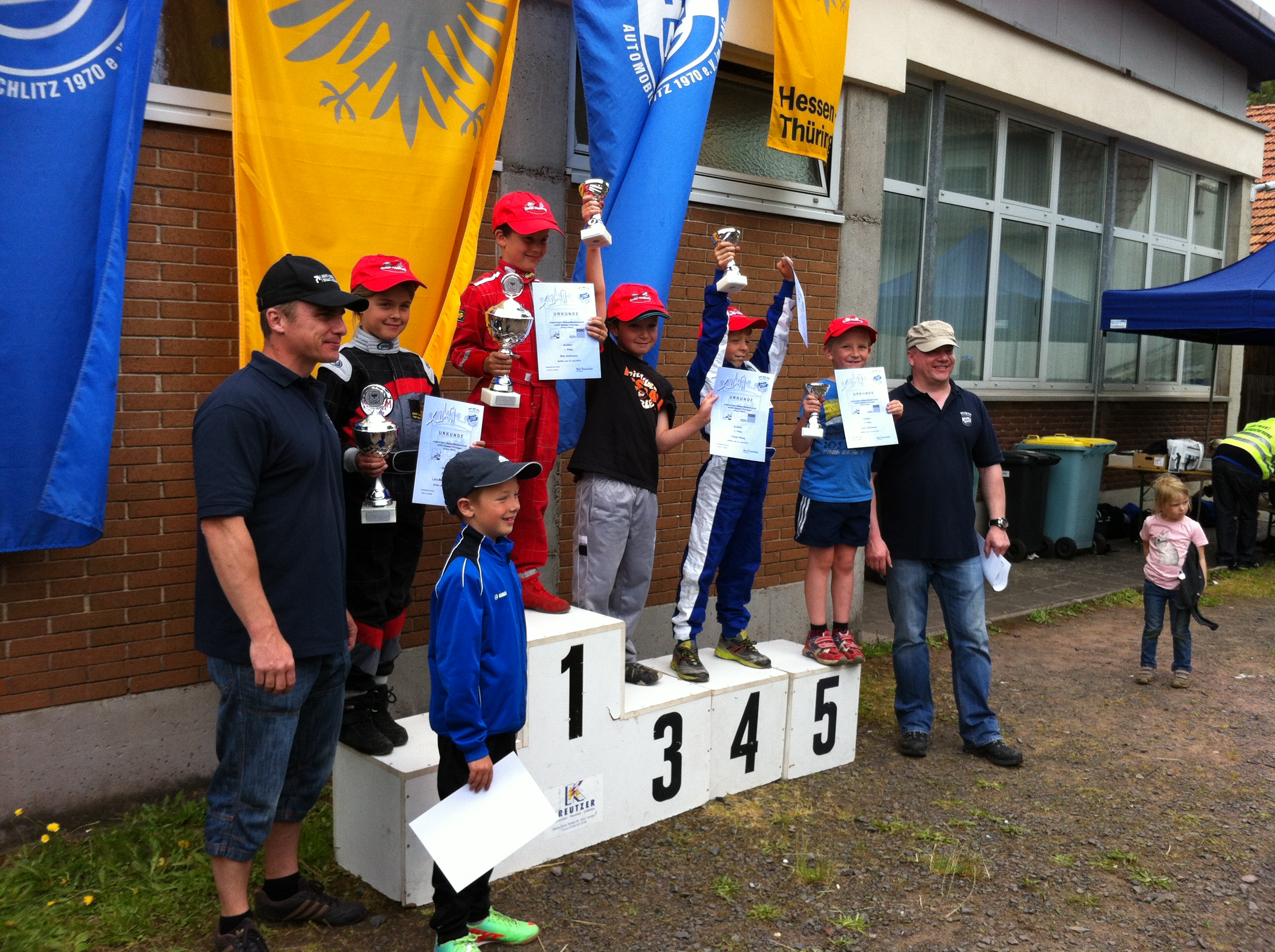 Klasse 1 Das Treppchen v.l. Platz 2 Lara-Marleene Briegel, AMSC Pohlheim, Platz 1 Nils Hofmann, MSC Rockenberg, Platz 3 Tobias Haug, MSC Wächtersbach, Platz 4 Rene Pascal Muht, MSC Horlofthal, Platz 5 Paul Kleinhans, RG Solms und davor Platz 6 Jannik Weber, RG Solms